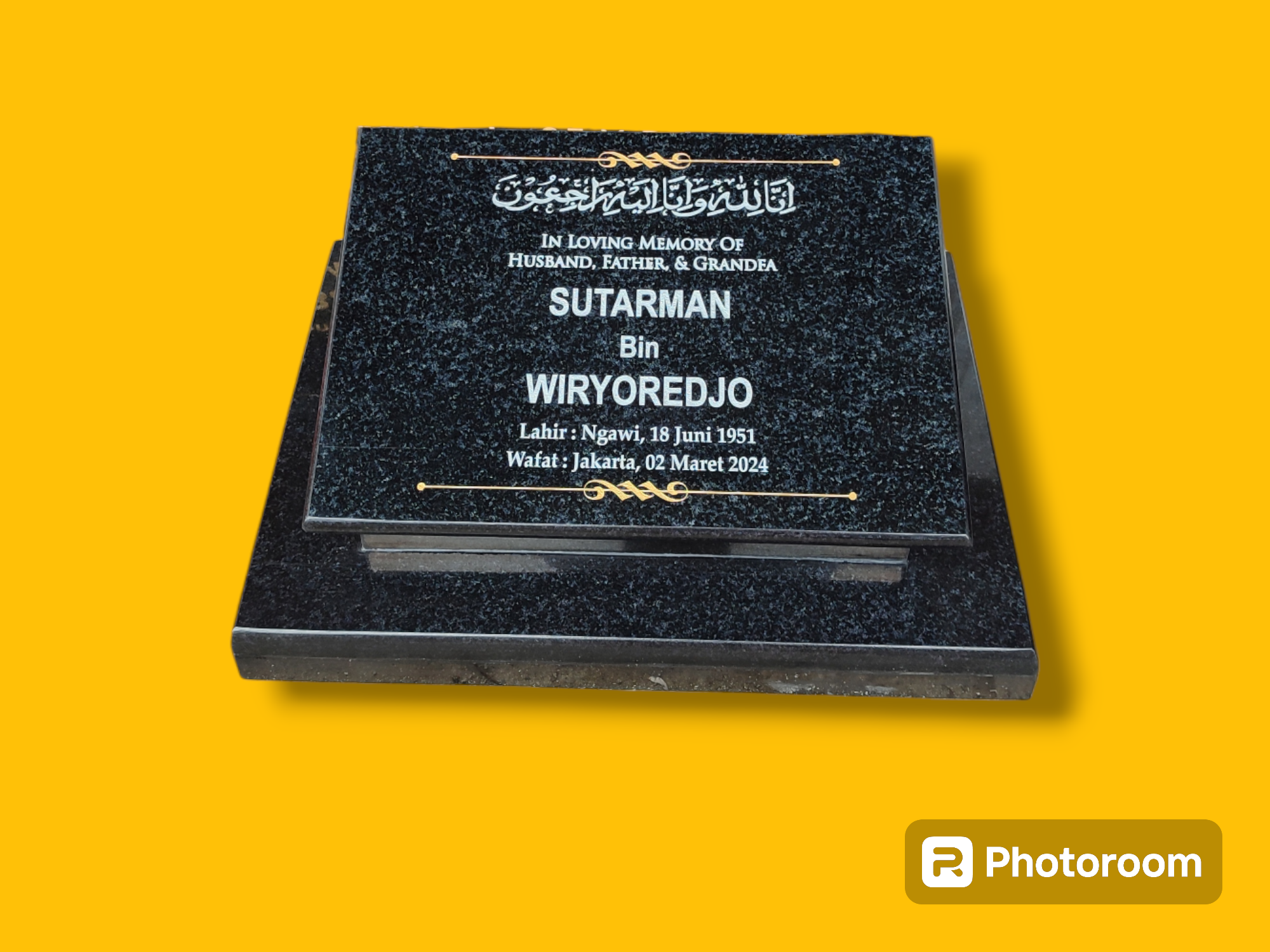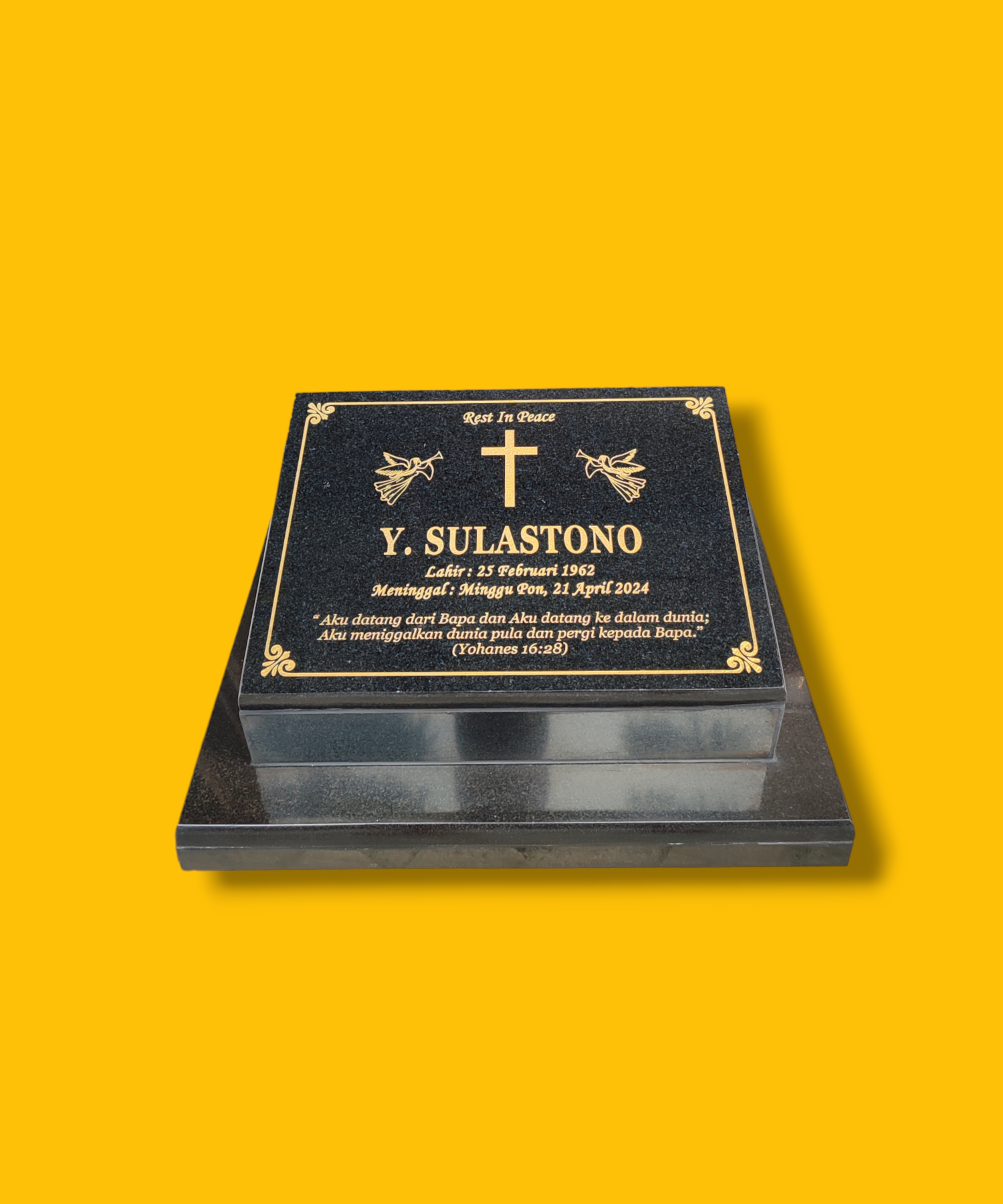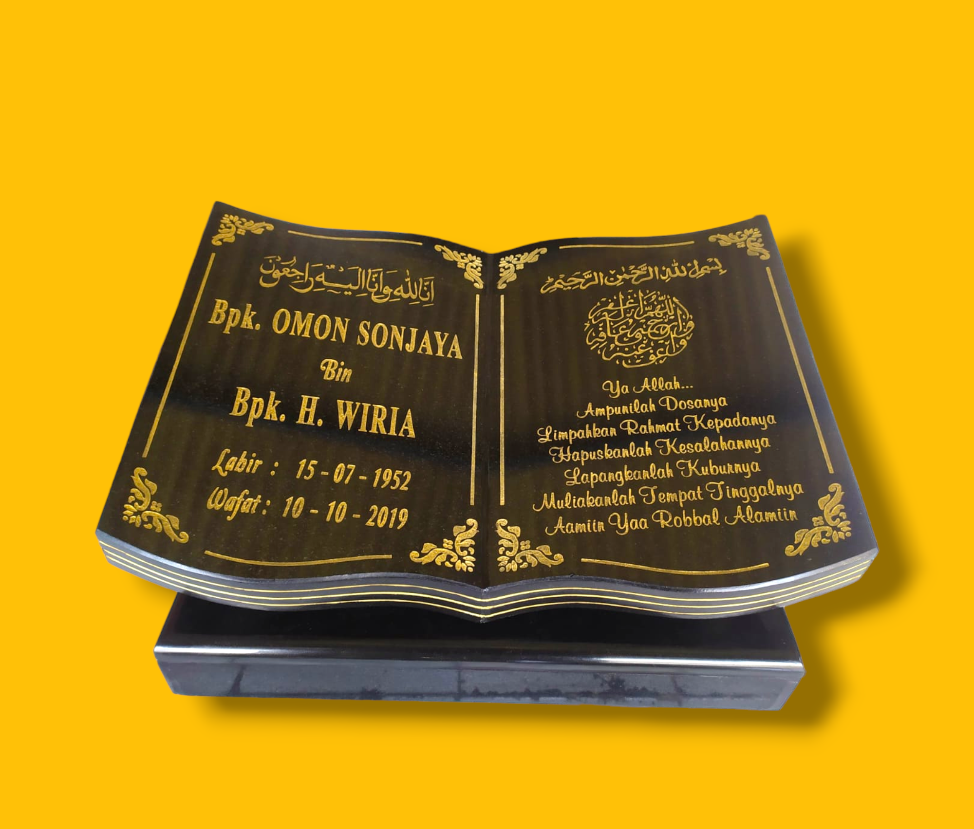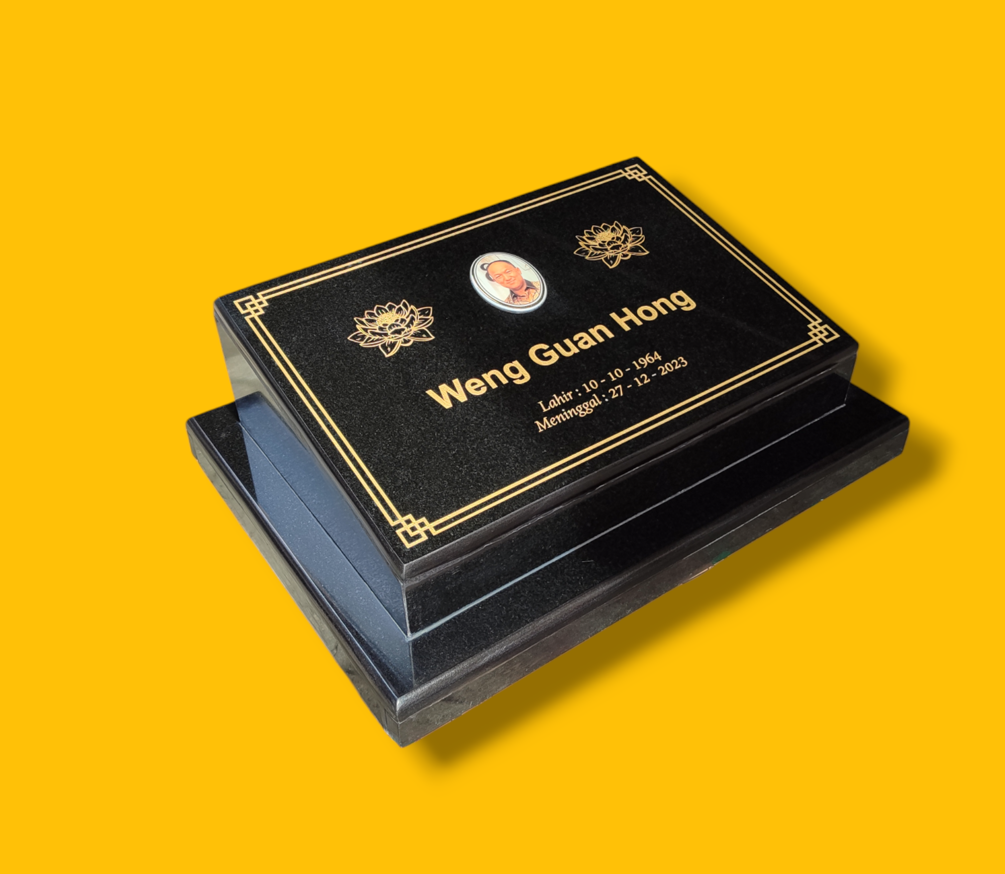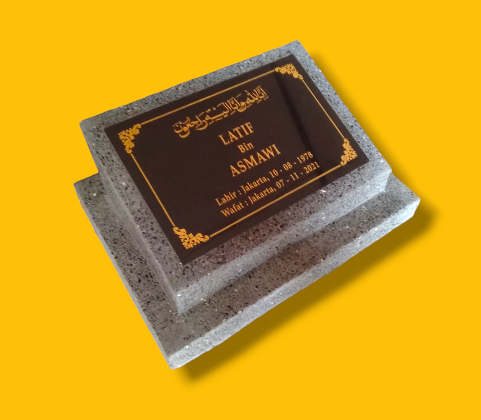 - Ukiran: Nama, tanggal lahir & wafat, kalimat doa, kutipan, atau foto keramik